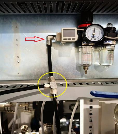 一、在設備壓縮空氣連接口處加裝鎖母三通,加裝位置(如下圖所示)要求在油霧器前端;