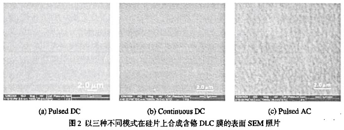 圖2顯示以三種不同模式在硅片上DLC膜的表面SEM照片,從圖中可以看出,在三種模式下合成DLC膜的表面形貌差異很大。在類似沉積條件下,脈沖模式下形成薄膜表面更加平滑,在脈沖DC模式下最為平滑。薄膜平均表面粗糙度Ra的測量值和觀測結果一致,在連續DC模式下薄膜Ra為25nm,脈沖AC模式下的是10nm,而在脈沖DC模式下的是4nm。