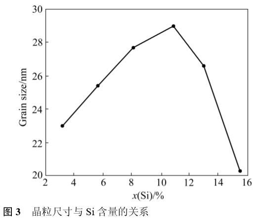 表1所列為6個樣品(S1~S6)的EDS分析結果。由表1可知,薄膜中N含量(摩爾分數)保持基本不變,隨著Si含量的增大,Ti含量逐漸下降。通過改變離子束濺射的束流和磁過濾線圈電流使薄膜中Si含量具有較強的可控性,所制備的TiSiN薄膜中Si含量在3.2%~15.5%的范圍。圖2所示為不同薄膜的XRD譜。從圖2可以看出,純TiN薄膜為面心立方(FCC)結構,具有(200)面擇優取向。TiSiN薄膜中晶相同樣具有(200)面擇優取向的FCC結構,且(200)峰明顯寬化。根據TiN薄膜的研究結果,當薄膜中不存在或存在較小的殘余應力時,以表面能最小的(200)面擇優取向。由此可見,樣品S1~S6中的殘余應力均較小。圖2中未出現晶相Si3N4和鈦硅化物的衍射峰,Si除了可能以非晶態Si3N4形式存在之外,由于物理氣相沉積的過程往往被認為是極不平衡的過程,所以還有可能以Ti(Si)N固溶體的形式存在,當固溶體中的Si達到飽和之后才能形成非晶態Si3N4。當TiN中部分Ti元素被Si元素取代后,由于Si的半徑小于Ti,必然會導致其晶格常數的降低。圖2中樣品S1~S3隨著Si含量的增加,(200)晶面逐漸向高角移動,之后穩定在42.6°。由此可見,樣品S1~S3薄膜中晶相是以Ti(Si)N固溶體的形式存在,當固溶體中Si飽和后,又有非晶態Si3N4相出現。根據(200)晶面衍射峰的半高寬,利用謝樂公式計算了薄膜中的晶粒尺寸,如圖3所示。TiSiN薄膜中的晶粒尺寸在20~30nm之間。隨著Si的摻入,晶粒尺寸變化不大,只在Si含量大于10.9%之后明顯下降。此現象與其他研究結構相似,非晶相Si3N4的出現,限制了晶粒的進一步生長,導致了晶粒粒徑的下降。