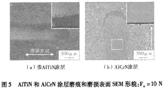 ?。?)AlCrN涂層的耐磨性明顯優于AlTiN涂層。相比AlTiN涂層,AlCrN涂層擁有良好的排屑機制,優越的抗磨粒磨損和抗氧化磨損性能,從而極大地拓寬了PVD硬質圖層的摩擦學應用范圍。