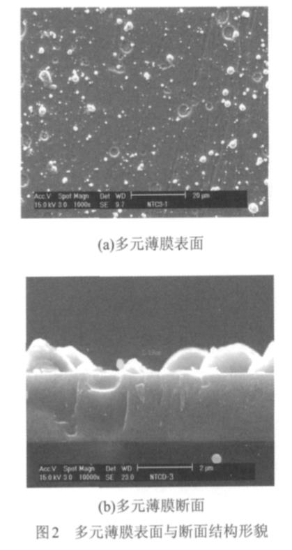 用S-3400N-Ⅱ型掃描電鏡觀測膜層表面與斷面形貌,并用附帶的OXFORDINCAEDS能譜儀分析鍍層成分;用超微負荷顯微硬度計測量鍍層的顯微硬度,加載時間15s,載荷25g(0.245N);用X射線衍射儀(XRD)對鍍層的晶態結構進行分析,石墨單色器、Cu靶、管電壓40kV、管電流30mA、掃描速度6º/min;用聲發射劃痕儀測膜基結合力;用表面性能測試儀測試膜層的耐磨性能,金剛石壓頭直徑?0.2mm,載荷為10N,采用往復式刻劃磨損試驗法觀測磨痕寬度。