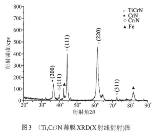 (2)(Ti,Cr)N鍍膜層的主體相為擇優220面及111面取向TiCrN相,同時,由于Cr含量較高,涂層中出現CrN相和Cr2N相。這種薄膜具有較高的顯微硬度,良好的結合力,優良的耐磨性能。