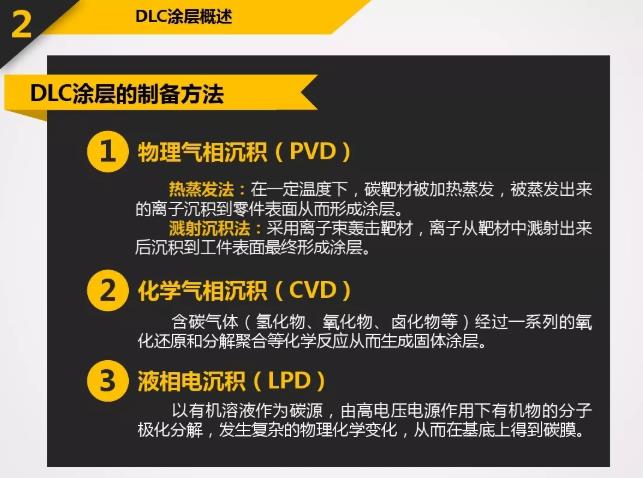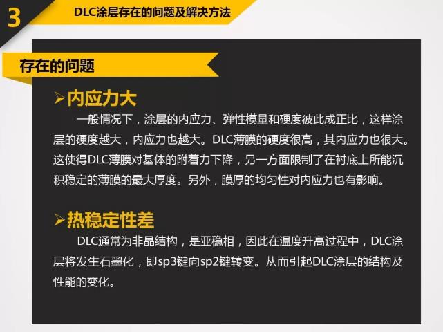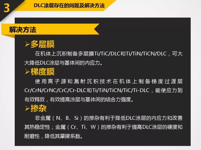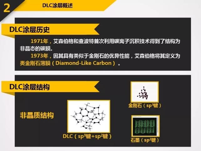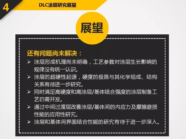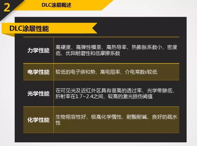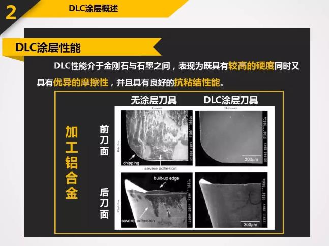 DLC具有很多優良的特性:高硬度-60GPa或Hv6000以上;低摩擦系數-0.06;極好的膜層致密性;良好的化學穩定性以及良好的光學性能等。應用于刀具上的DLC涂層所表現出的特殊性能遠超過其它硬質涂層。涂以DLC的刀具主要應用包括:石墨切削,各種有色金屬(如鋁合金,銅合金等)切削,非金屬硬質材料(如亞克力,玻璃纖維,PCB材料)切削等。