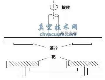 多靶濺射的結構如圖3所示。使基片在兩個以上靶的上方轉動,控制每種膜的沉積厚度為一個或幾個原子層,輪翻沉積,這樣就能制取化合物膜。例如,有人使用InSb和GaSb靶,制得了In1-xGaxSb單晶膜。雖然這種裝置復雜一些,但是通過控制基片的轉動速度和改變各個靶上所加的電壓,可以得到任意組分的膜;按照鍍膜的時間,控制這些參數,可以在膜厚的方向上任意改變膜的組分,而且能獲得超晶格結構。