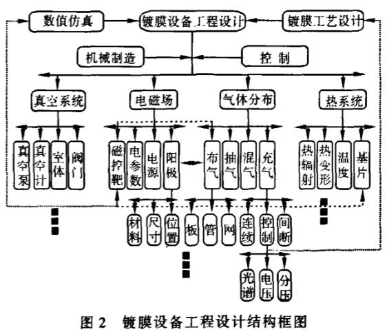對于濺射鍍膜來說,可以從真空系統(tǒng),電磁場,氣體分布,熱系統(tǒng)等幾個方面進行沒計,機械制造和控制貫穿整個工程設(shè)計過程,參照圖2。