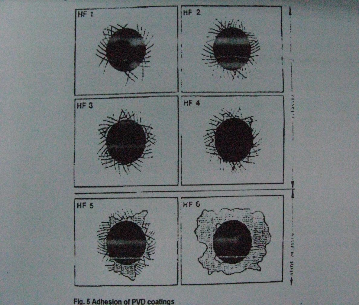 壓痕測試法是一種“定性”測量膜基結合力的方法,用洛氏硬度計的金剛石壓頭在樣品的指定位置上打壓出一個凹坑,凹坑處的樣品基材由于變形兒時基材與涂層之間產生相應的應力,該應力有可能使凹坑周圍的涂層脫落。對于不同材料的基體,采用不同的測試方法。對于鋼基體,采用HRC方法,其測試加壓載荷為150Kgf;對于硬度高的基體,如硬質合金等,采用HRA方法,其測試加壓載荷為60Kgf。在顯微鏡下觀察凹坑的形貌,與標準對比,判斷涂層的結合力是否合格。HF1-HF4均為合格,HF5-HF6均為不合格。