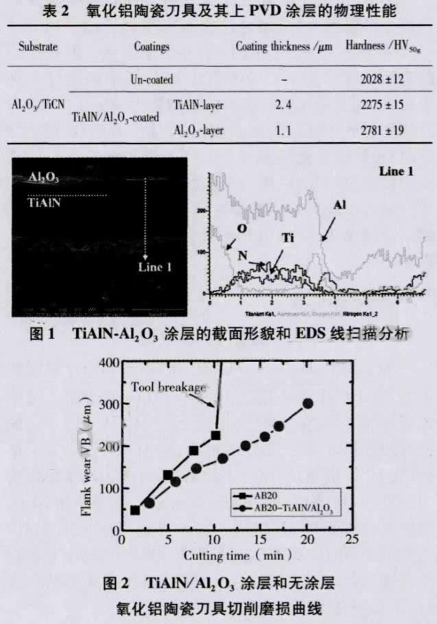 表2列出了無涂層和TiAlN/Al2O3涂層的硬度表征結果,可見PVD法沉積的硬質涂層可顯著提高氧化鋁刀具硬度,作為硬質、耐磨中間層的TiAlN涂層可將刀具表面硬度提高40%,從而有效增加刀具耐磨性。而充當TiAlN耐磨層化學屏障角色的Al2O3涂層,其硬度也比氧化鋁基體高10%左右。涂層的顯微硬度與涂層材質和微觀結構有關,同等材質下,致密細晶結構的硬度更高。