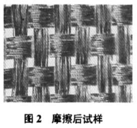 由圖2可見,經(jīng)組織點處鈦膜的磨損明顯多于緯組織點,說明經(jīng)紗摩損大于緯紗,這與經(jīng)、緯紗性質(zhì)及織物結(jié)構(gòu)有關(guān)。試樣中經(jīng)、緯紗細度相差不大,但經(jīng)密明顯大于緯密,造成經(jīng)紗屈曲波高(h1)大于緯紗屈曲波高(hw),故而試樣表面經(jīng)組織點比緯組織點更突出。對鍍膜試樣進行平磨時,經(jīng)組織點與磨料的接觸比緯組織點充分,使得經(jīng)組織點處鈦膜磨損更嚴重。