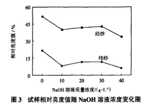 從圖3可以看出,堿減量預處理之后鍍膜,試樣經(jīng)、緯紗相對亮度值范圍分別為34.0%~42.9%、6.2%~11.8%,均低于普通水洗試樣的51.7%、21.8%,說明堿減量處理對改善鈦膜耐磨性和提高膜基結(jié)合牢度有利。鈦膜耐磨性隨NaOH溶液濃度變化有所不同,且經(jīng)、緯紗變化趨勢基本一致。由圖3可知,隨NaOH溶液質(zhì)量濃度提高,試樣相對亮度先緩慢上升,在30g/L后又有所下降,即鈦膜耐磨性先減小、后增加。