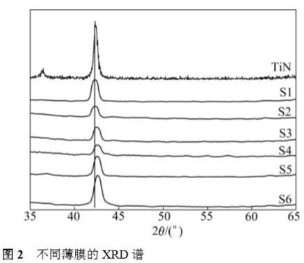 表 1 所列為 6 個樣品(S1~S6)的 EDS 分析結果。由表1可知,薄膜中N含量(摩爾分數)保持基本不變,隨著Si含量的增大,Ti含量逐漸下降。通過改變離子束濺射的束流和磁過濾線圈電流使薄膜中 Si 含量具有較強的可控性,所制備的 TiSiN 薄膜中 Si 含量在 3.2%~15.5%的范圍。