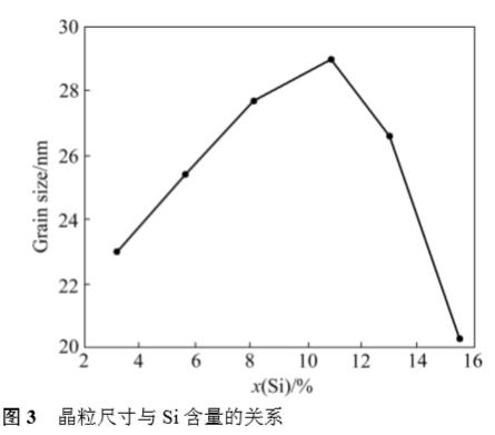 圖 2 所示為不同薄膜的 XRD 譜。從圖 2 可以看出,純 TiN 薄膜為面心立方(FCC)結構,具有(200)面擇優取向。TiSiN 薄膜中晶相同樣具有(200)面擇優取向的 FCC 結構,且(200)峰明顯寬化。根據 TiN 薄膜的研究結果,當薄膜中不存在或存在較小的殘余應力時,以表面能最小的(200)面擇優取向 。由此可見,樣品S1~S6中的殘余應力均較小。圖2中未出現晶相 Si3N4 和鈦硅化物的衍射峰,Si 除了可能以非晶態 Si3N4 形式存在之外,由于物理氣相沉積的過程往往被認為是極不平衡的過程,所以還有可能以 Ti(Si)N 固溶體的形式存在,當固溶體中的Si達到飽和之后才能形成非晶態 Si3N4。當 TiN 中部分 Ti 元素被 Si 元素取代后,由于Si的半徑小于Ti,必然會導致其晶格常數的降低。圖 2 中樣品 S1~S3 隨著 Si 含量的增加,(200)晶面逐漸向高角移動,之后穩定在 42.6°。由此可見,樣品 S1~S3 薄膜中晶相是以 Ti(Si)N 固溶體的形式存在,當固溶體中 Si 飽和后,又有非晶態 Si3N4 相出現。根據(200)晶面衍射峰的半高寬,利用謝樂公式計算了薄膜中的晶粒尺寸,如圖 3 所示。 TiSiN 薄膜中的晶粒尺寸在 20~30 nm 之間。隨著 Si 的摻入,晶粒尺寸變化不大,只在Si含量大于10.9% 之后明顯下降。此現象與其他研究結構相似,非晶相 Si3N4 的出現,限制了晶粒的進一步生長,導致了晶粒粒徑的下降。