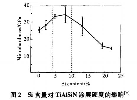 在Si含量較少的TiAlSiN涂層(約為2%,原子分數)中,Al和Si原子置換fcc結構TiN晶格中Ti原子的位置,形成TiAlSiN固溶體,而Al和Si的原子半徑小于Ti的原子半徑,會引起晶格畸變,使品格常數減小;當Si含量逐漸增多(約為5%,原子分數)時,涂層中出現非晶Si3N4相,形成Si3N4非晶包裹TiAlN納米晶的復合結構,使涂層晶粒長大受到抑制;當si含量增加到一定值(約為22%,原子分數)時,非晶相Si3N4增多,以致形成納米晶甚至非晶。受制備方法和工藝的影響,也可能在TiAlSiN涂層中同時形成h-A1N相。