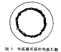 觀察靶陰極電弧的燃燒情況,每當電弧熄滅前,總是發現電弧弧斑極為粗糙(參見圖7)。有時甚至出現堆團狀弧斑。熄滅后觀察靶面已發紅,靶表面溫度很高,粗糙弧斑的出現,使弧電流較集中于靶面一點,導致了弧斑下靶面斑點電流過于集中,使弧斑下的靶面溫度更高而產生大量的熱電子發射。靶面局部大量的熱電子發射的結果,一方面中和了大量的空間電荷,使陰極表面上的電場成為減速場,甚至導致陰極表面上的電場等于零。另一方面,大量的熱電子發射對陰極表面產生相當大的冷卻作用。