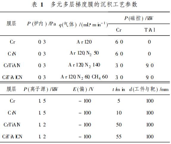 基材裝進真空室后抽真空至5*10的-3Pa,通氬氣至0.1Pa,用離子源結合偏壓濺射清洗基材表面后依次沉積Cr,CrN,CrTiAlN,CrTiAlCN,沉積工藝參數見表1。