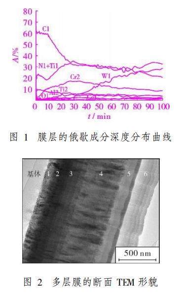 用PHI700型納米掃描俄歇系統分析多層膜成分。用CM200FEG型透射電子顯微鏡(TEM)及JSM5910型掃描電鏡(SEM)觀察多層膜的表面形貌。膜層的顯微硬度用MH-5D型顯微硬度計測量,采用維氏壓痕,載荷0.25N,保荷15s。采用HH-3000型薄膜結合強度劃痕試驗儀測量膜/基結合力,最大載荷100N,加載速度100N/min,劃痕速度4mm/min。采用MS-T3000型球盤摩擦磨損試驗儀在大氣環境下測試膜層摩擦性能,載荷3N,旋轉半徑20mm,轉速400r/min,測試時間120min。5個直徑0.3mm的鉆頭沉積多層薄膜后,鉆削厚1.5mm的4層覆銅的玻璃纖維增強層復合板,收集斷針數據,進行自動光學檢查(AOI)孔位量測、切片,測試鉆頭斷針、批鋒、塞孔、孔位精度、孔粗,鉆削參數見表2。