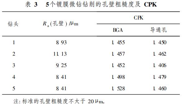 5個鉆頭鍍多層膜后鉆削的孔壁粗糙度及孔位精度制程能力指數(CPK)見表3。由表3可知:5個鉆頭鍍多層膜后,在鉆削中均無斷針、批鋒、塞孔現象,CPK達到技術指標(1.33以上),孔壁粗糙度也滿足技術指標,使用壽命提高1倍多,鉆孔品質能滿足實際要求。