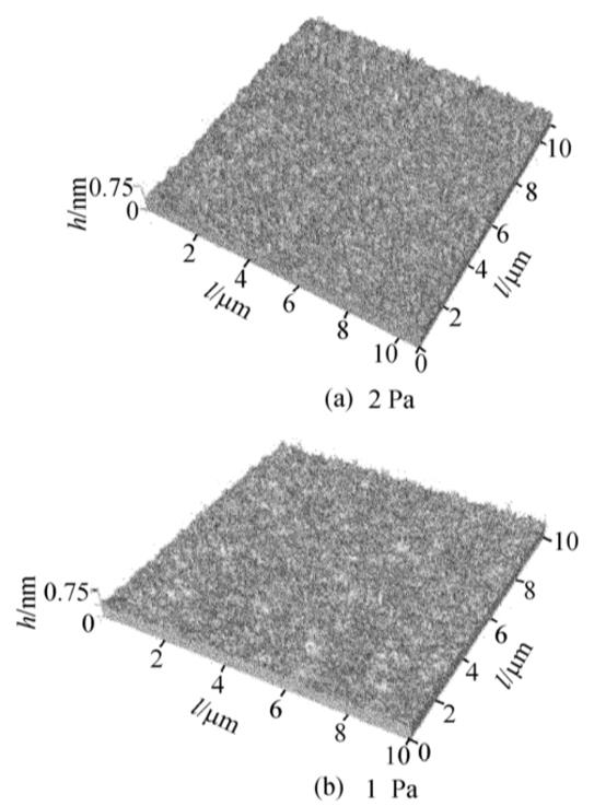 濺射氣壓為1Pa時,薄膜的平均粗糙度Ra值為1.160nm,方均根粗糙度Rq值為1.476nm。濺射氣壓為2Pa時,其Ra值為1.686nm,Rq值為2.130nm。