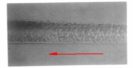 實驗中以鉆石頭刮取鍍層表面,并輔以光學顯微鏡觀察鍍層破壞的模式。圖2是經刮痕試驗后,鍍層的破壞型態光學顯微鏡照片,由圖中可看出鍍層為一完全附著于基材之同形狀的半圓形裂痕軌跡(conformal cracking)。所以鍍層破壞為一張應力破壞,因此在彈性限內鍍層中若有殘存軸向壓應力,應有助于平衡相反之作用力所產生之張應力分量,如此便可增加臨界荷重,亦即增加附著性。