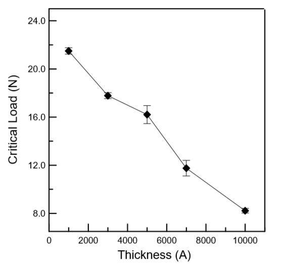 圖4為偏壓Vb=-60V、氧流量為6sccm時,不同厚度下,鍍層和基材間附著性變化情形。由圖中得知隨著鍍層厚度的增加,其附著性隨之減少。Smith在薄膜軸向應力研究中指出在相同應力下,較厚之鍍層會比薄鍍層容易剝落破壞,如下列式子所示: