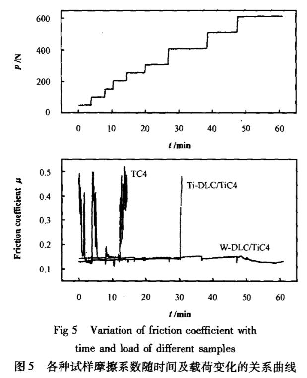 c、摻雜w元素的W-DLC/TC4薄膜由于在薄膜中形成WC微晶,有利于提高膜層的耐磨性及其硬度和膜/基結合強度,具有更高的承載能力及更優異的抗磨性能,更適合于易磨損器件的表面改性。