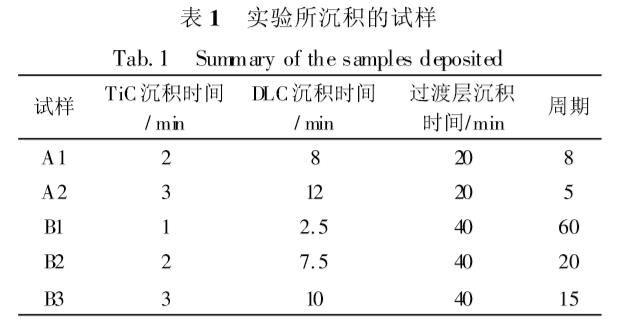 類金剛石(DLC)膜是近年研究較多的薄膜材料之一,它具有許多與金剛石相似或相近的優良性能,如硬度高、彈性模量高、摩擦系數低等。遺憾的是,沉積DLC膜時,膜與基體之間會產生較大的內應力,影響膜與基體的結合,甚至產生膜脫落現象,嚴重影響了DLC膜的應用。為此,人們企圖通過界面設計,采用其它材料與DLC形成多層化結構或多元化膜層,減少膜的內應力并使之與基體具有良好的結合力,從而提高膜層的耐磨性。如金屬/DLC多層膜,它們的內應力比單一的金屬層或DLC層小,硬度卻介于金屬和DLC之間,而有關碳化物/DLC多層膜的研究不多,文獻采用過濾式陰極電弧法制備出DLC/TiCx,和DLC/WCx多層膜,這兩種膜的摩擦性能都較單一膜的性能好,類似的研究還有DLC/TiB2多層膜,其硬度和耐磨性與碳的含量有關。本文采用非平衡磁控濺射和離子源復合沉積的方法,以高純Ti為靶材,用甲烷氣體作碳源制備了TiC/DLC多層膜,通過對多層膜的微觀結構及成分分布的分析,找出制備TiC/DLC多層膜的工藝參數,為尋求制備結合強度高、性能優良的多層膜提供實驗依據。
