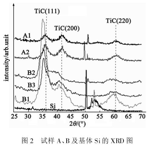圖2是試樣A、B和基體Si的XRD圖,試樣A的三強衍射峰大約在36.0°,41.8°和60.6°衍射角(2θ)處,經分析標定為具有面心結構的TiC(111),(200)和(220)的衍射峰,相應的晶格常數為a=0.3420mm,衍射譜線上無Ti相和石墨相的衍射峰存在;這說明部分碳和鈦相互結合形成TiC,而另一部分碳或以非晶形式存在于薄膜中。試樣B的衍射峰往低衍射角偏移,并且在第一峰的右邊呈現一個肩峰,而在粉末衍射(PDF)卡片中具有六方結構的Ti,晶格常數為a=0.2950nm,c=0.4628nm,它的三個主要衍射峰分別位于35.09°,38.4°和40.2°處,其對應的晶面和晶面間距分別為(0110)0.2555nm,(0002)0.2341nm和(011)0.2243nm,由此可推測試樣B的第一強峰可能是由Ti相的(0110)和TiC相的(111)兩者衍射的疊加,其衍射肩峰(第二衍射強峰)的產生也是由Ti相衍射和TiC相的衍射疊加的結果,試樣B的第三衍射強峰為TiC的(220)的衍射峰,因此試樣B中存在TiC相和少量的Ti相。另外基體的衍射譜線中出現Si的(111),(321)的衍射峰。