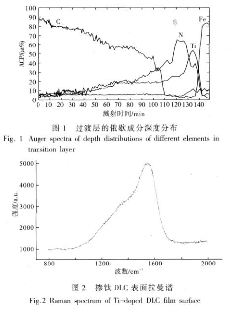 圖1為Ti-DLC/鋼樣品的俄歇(Auger)成分深度分布曲線,依次為鋼基體,層間界面是一個交匯漸變的過渡過程。