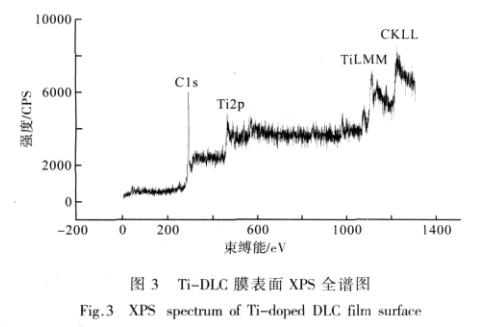 圖3為Ti-DLC膜層的XPS全譜圖,由圖可見:膜層中除了碳之外,存在著鈦(含量為6.8at%),少量的氧估計是表面吸附污染所致。