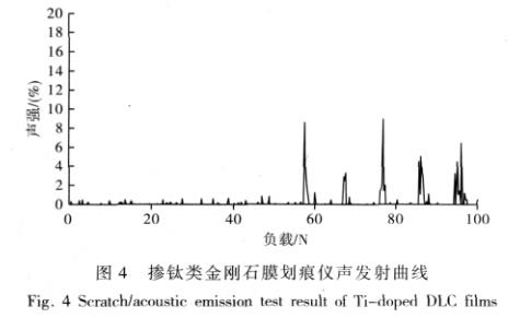 在裝240件316L不銹鋼表殼的條件下,按表1的工藝,所沉積的Ti-DLC膜層厚度約1.1μm。由于膜層薄,在Si基體上測量的硬度為2232Hv。圖4為在不銹鋼基體上沉積1.1μm的膜所測得的結合力曲線圖。由圖可見,在57N處出現較強信號,結合在顯微鏡可觀察到該處有較明顯的崩膜,故判斷結合力為57N。經測量摩擦系數為0.15。
