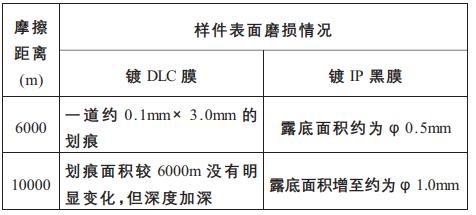 采用鐘表行業常用于檢測表面涂層耐磨性方法,手表外觀件經鍍DLC膜后取表帶中的一截,與中密度纖維板(粗糙度為2.5~3.5μm)往復磨擦,載荷為2.45N。同時采用某公司已批量生產于手表外觀件的IPG(離子鍍TiN)表帶粒進行對比。具體結果如下表2。