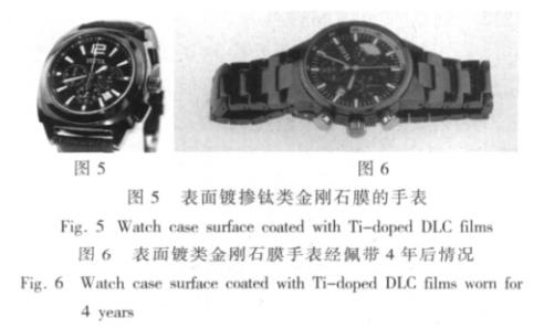 將表面鍍Ti-DLC膜的表殼及表帶若干件人工汗實驗48h后,膜層的整體顏色無發生變化、沒有出現鹽析和銹蝕現象。