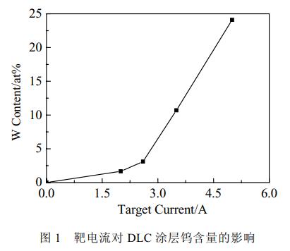 圖1為靶電流對DLC涂層鎢含量的影響曲線。從圖可以看出,靶電流較低時(shí),隨著靶電流的增加,DLC涂層的鎢含量緩慢增加;但當(dāng)靶電流超過2.8A以后,DLC涂層的鎢含量隨著靶電流的增加而明顯增大。其原因在于靶電流較低時(shí)鎢靶表面被富碳的化合物沉積層覆蓋,濺射出來的鎢粒子較少;但當(dāng)靶電流增大到一定程度后,鎢靶表面的化合物沉積層被完全濺射掉,繼續(xù)增加靶電流將使濺射出來的鎢粒子明顯增多,因而DLC涂層的鎢含量隨著靶電流的增加而顯著增大。