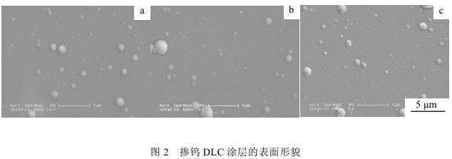 圖2為不同鎢含量的DLC涂層表面形貌。從圖可以看出,摻鎢DLC涂層光滑致密,但存在一些大小不一的顆粒和凹坑等缺陷,其尺寸在幾百納米到幾個(gè)微米之間變化。它們主要是由過渡層制備過程中陰極電弧的噴射產(chǎn)生的,這導(dǎo)致DLC涂層的表面粗糙度明顯增大,對進(jìn)一步降低DLC涂層的摩擦系數(shù)不利。從圖2還可以看出,不同鎢含量的摻鎢DLC涂層表面形貌差別不大,這是因?yàn)椴煌u含量的DLC涂層的過渡層制備工藝相同。