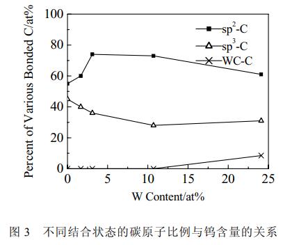 利用XPS的C1s譜可以計(jì)算出DLC涂層中不同結(jié)合狀態(tài)的碳比例。圖3為摻鎢DLC涂層中不同結(jié)合狀態(tài)的碳原子分?jǐn)?shù)與鎢含量的關(guān)系曲線。從圖3可以看出,隨著鎢含量的增加,DLC涂層中以sp3鍵結(jié)合的碳原子分?jǐn)?shù)逐漸降低,以sp2鍵結(jié)合的碳原子分?jǐn)?shù)逐漸增加;這是由于引入鎢原子減少了與碳配位的其他碳原子數(shù)所致。但當(dāng)鎢含量到達(dá)10%后,sp3鍵結(jié)合的碳原子分?jǐn)?shù)不再降低,DLC涂層中發(fā)現(xiàn)了一定量的WC結(jié)合的碳原子,DLC涂層中生成納米尺寸的WC有利于改善DLC涂層的韌性。