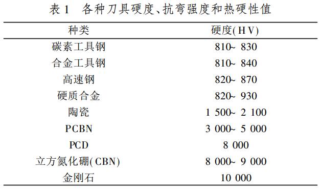 金剛石刀具具有硬度高、抗壓強度高、導(dǎo)熱性好和耐磨性好等特性,可在高速切削中獲得很高的加工精度和加工效率。由于聚晶金剛石(PCD)的結(jié)構(gòu)是取向不一的細晶粒金剛石燒結(jié)體,雖然加入了結(jié)合劑,其硬度及耐磨性仍低于單晶金剛石。表1給出了各種刀具的硬度值,PCD的硬度可達8000HV,為硬質(zhì)合金的8~12倍;CBN晶體結(jié)構(gòu)與金剛石類似,因此具有與金剛石相近的硬度和強度;CBN微粉的顯微硬度為8000~9000HV,其燒結(jié)體PCBN的硬度一般為3000~5000HV。