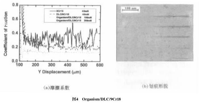 在圖4a中,9Cr18和DLC/9Cr18的摩擦系數(shù)(最大法向載荷為40mN)約分別為0.35和0.2,Organism/DLC/9Cr18的摩擦系數(shù)(最大法向載荷為100mN,對應(yīng)圖4b中下面第二條劃痕)為0.15,固體潤滑效果明顯,當(dāng)最大法向載荷為300mN時,Organism/DLC/9Cr18在100um~200um范圍內(nèi)的摩擦系數(shù)較穩(wěn)定,約為0.15,說明壓針在Organism/DLC中刻劃,隨后,摩擦系數(shù)逐漸變大,說明壓針劃到基體,摩擦系數(shù)最終接近基體的摩擦系數(shù),對應(yīng)圖4b中上面第三條劃痕,從劃痕顯微照片和摩擦曲線對比發(fā)現(xiàn),摩擦系數(shù)開始變大對應(yīng)于殘余劃痕的起點,說明壓針劃入軟基體,有殘余劃痕存在。