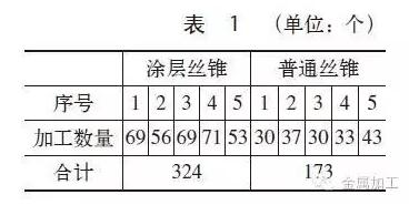 試驗方法:分別取5支涂層絲錐與5支普通絲錐加工工件,因基體材料相同,故采用相同切削參數。研究絲錐的壽命及工件加工質量。